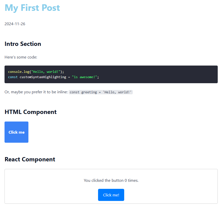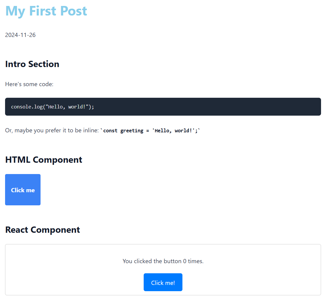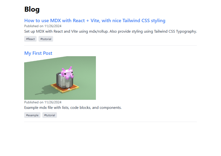 I've also created a GitHub repository that you can use as a template to get started with MDX, React, and Vite. Each branch corresponds to a step in this post. They build up incrementally so you can follow along. Click the links in the section title to go to a branch. It is essentially a simpler version of my blog (this one you are reading right now is an mdx file!) and I hope it helps you build yours too.